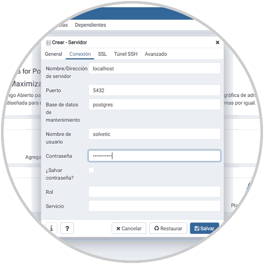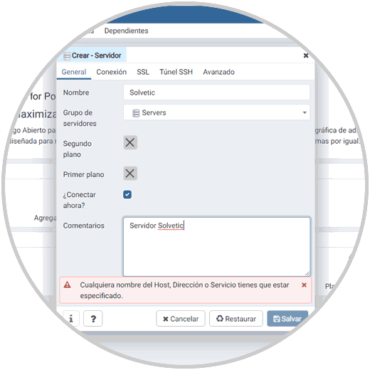 Allí debemos conectar el servidor PostgreSQL, para ello damos clic en “Agregar un Nuevo Servidor” y en la ventana emergente definimos: