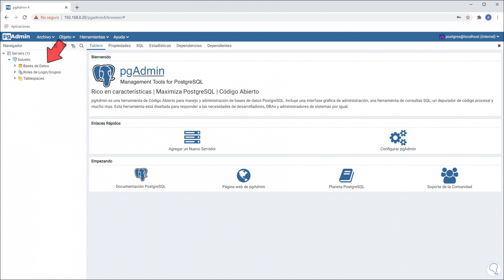 Damos clic en “Salvar” y esto nos abrirá la gestión de PostgreSQL: