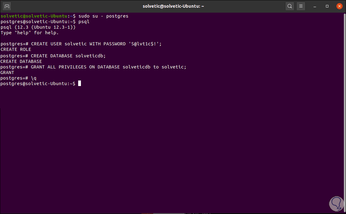 CREATE USER “usuario” WITH PASSWORD 'contraseña'; CREATE DATABASE “base de datos”; GRANT ALL PRIVILEGES ON DATABASE “base” to “usuario”; \q
