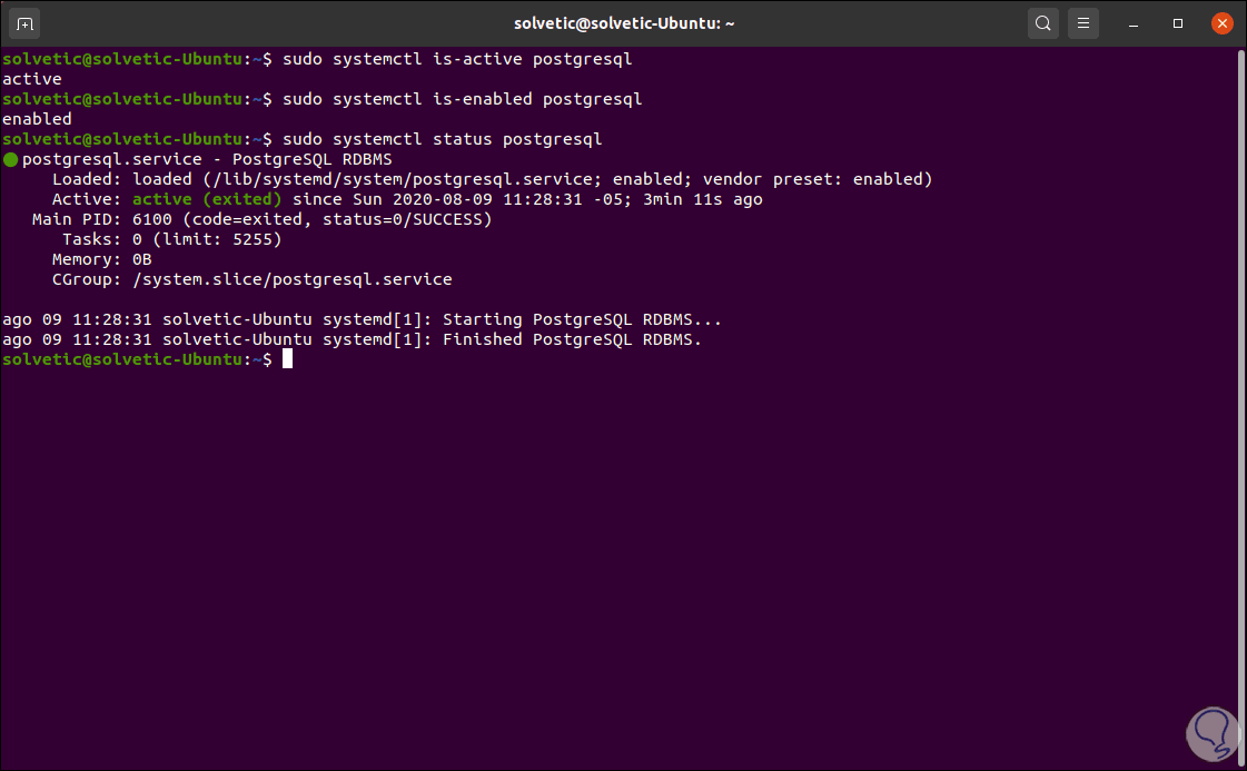 sudo systemctl is-active postgresql (activa PostgreSQL) sudo systemctl is-enabled postgresql (habilita PostgreSQL) sudo systemctl status postgresql (vemos el estado de PostgreSQL)