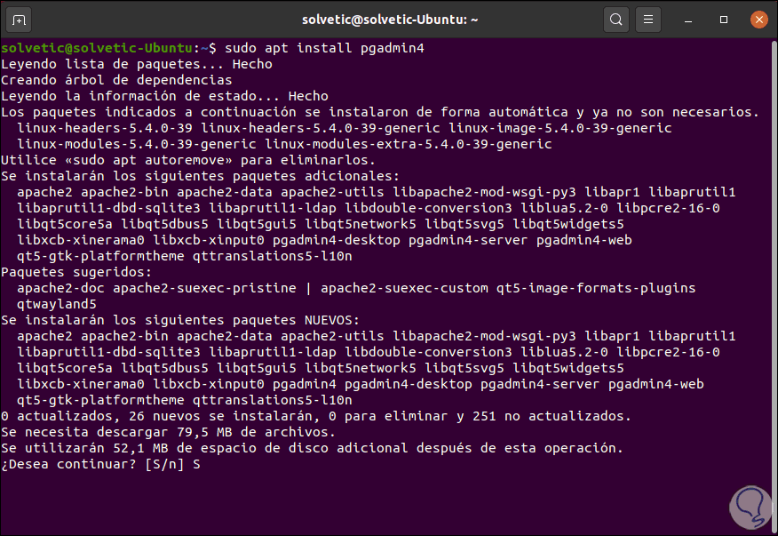 Ingresamos la letra “S” para confirmar la descarga e instalación, allí se instalarán los paquetes necesarios, incluyendo el servidor web Apache2. Este permite el acceso a aplicación pgadmin4-web desde un navegador web.
