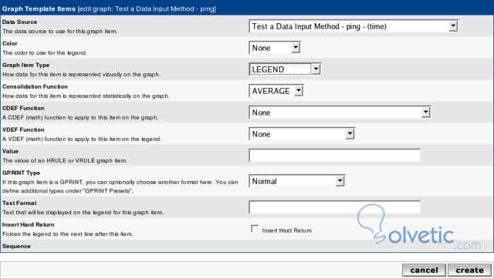 Hacemos click en Graph Templates para ver una lista de las plantillas creadas que están siendo usadas actualmente por el poll de información. Escogemos una para abrir sus propiedades. Hacemos click en Add que se encuentra al lado de Graph Input Items para añadir un campo nuevo. Se nos desplegarán una lista de opciones tales como Data Source, Color, Graph Item Type, Value, entre otras. Hacemos click en Create y luego en Save. Para que los cambios tomen efecto refrescamos.