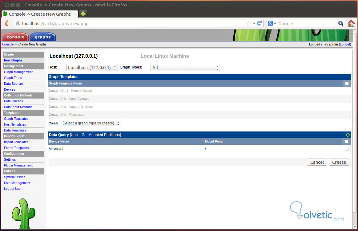 Adicionalmente a todas las funcionalidades que nos trae Cacti, podemos cargar plantillas ya construidas y que están disponibles online en la página www.debianhelp.co.uk/cactitemplates.htm. Las descargamos y luego hacemos click en Import template y seleccionamos el archivo para importarla. Luego necesitamos importar el script asociado que contiene la información en como y que debe capturar. Nos vamos a Data Sources, hacemos click en Add y escogemos un dispositivo y la plantilla que acabamos de subir. Por último hacemos click en Create y luego en el campo de la fuente ingresamos la fuente del script y luego hacemos click en el botón Create. Se recomienda que guardemos todos nuestros scripts en una sola ruta por ejemplo pueden estar: home/user/cacti/scripts/routertats.pl