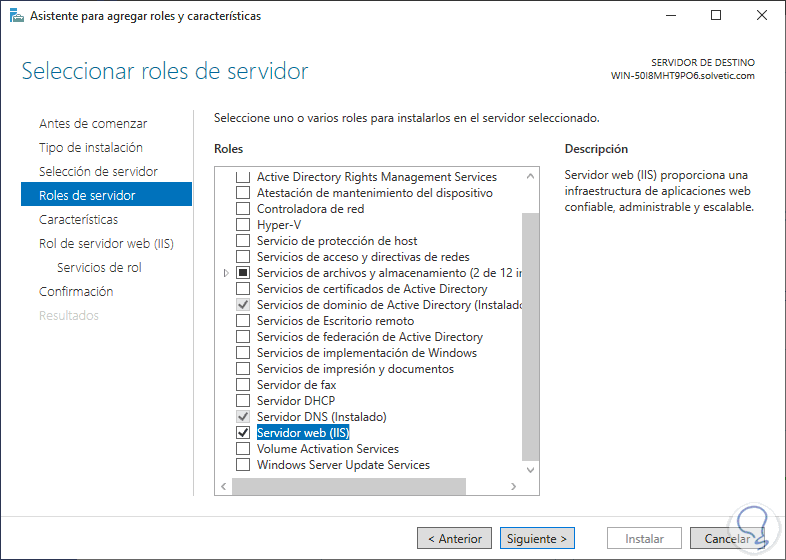 En la próxima ventana encontramos los roles del servidor, allí ubicamos la opción “Servidor web (IIS)”: