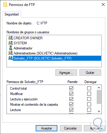 Damos clic en “Quitar” y pulsamos en “Agregar” e ingresaremos el nombre del grupo FTP que ha sido creado: