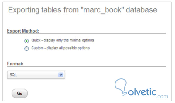 Aquí tenemos dos opciones, Quick (rápido) y Custom (personalizado), donde la primera nos permite generar un backup completo, en formato SQL con los parámetros básicos, y sin la posibilidad de seleccionar las tablas ni otras opciones, y la segunda nos lleva un poco más allá y nos muestra más opciones como seleccionar que tablas deseamos exportar, el formato, la estructura del archivo, su codificación, etc.