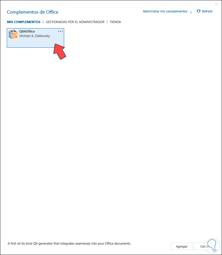 En la ventana desplegada seleccionamos “QR4Office” y damos clic en “Agregar”: