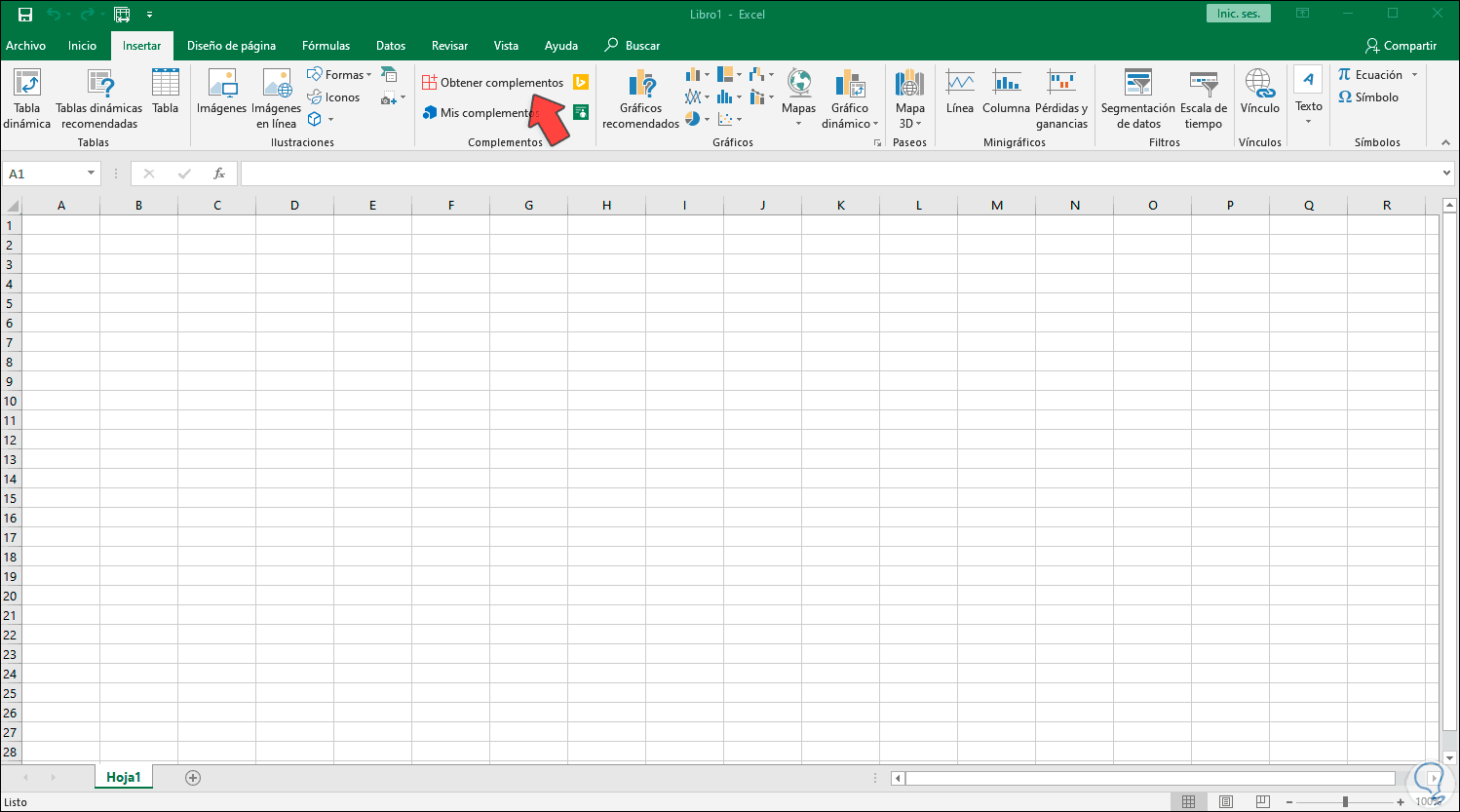 Para este caso usaremos inicialmente Microsoft Excel, para ello abrimos un libro nuevo y vamos al menú Insertar, en el grupo Complementos damos clic en “Obtener complementos”: