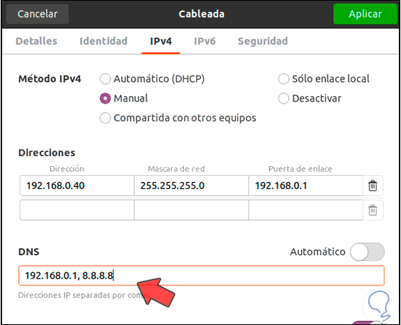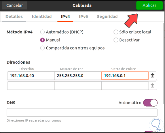 Es posible agregar más direcciones IP en los campos inferiores. Podemos ver que en la sección DNS el valor por defecto es “Automático”, allí pulsamos sobre este interruptor para que sea manual y procedemos a ingresar la dirección DNS a usar: