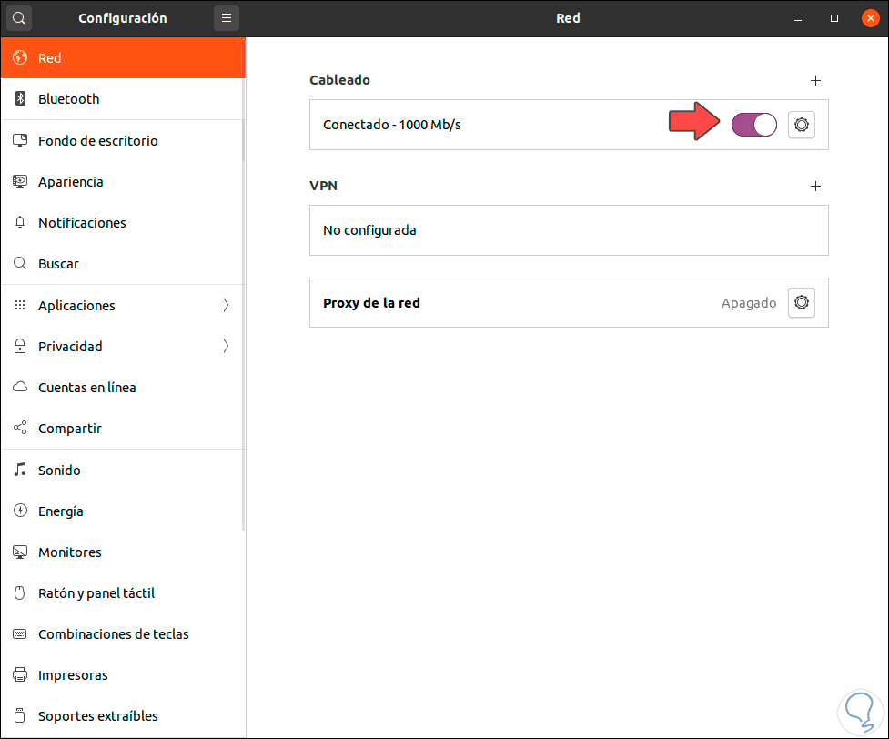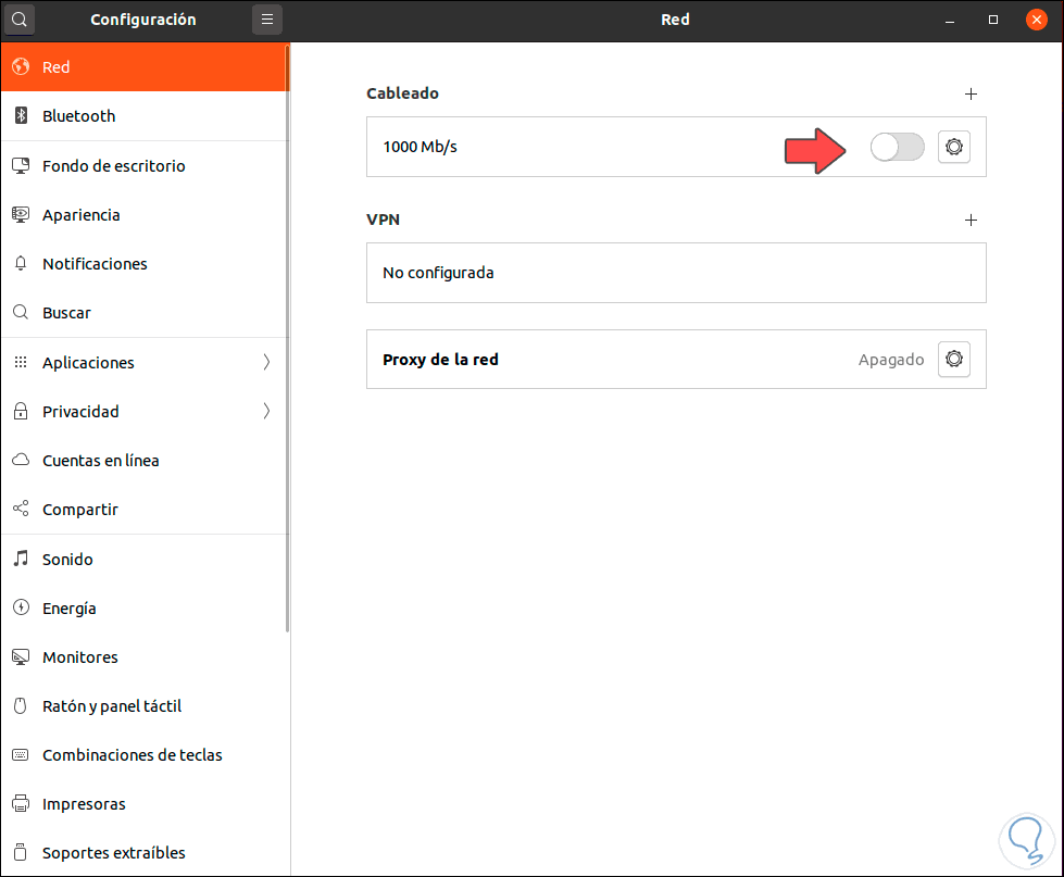 En este caso usaremos la IP de la puerta de enlace y el DNS público de Google. Damos clic en Aplicar para completar el proceso. En la ventana principal de Red debemos pulsar sobre el interruptor de red para desactivarla de forma temporal: