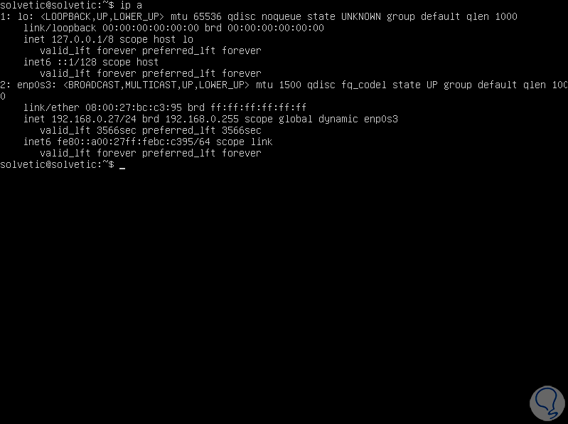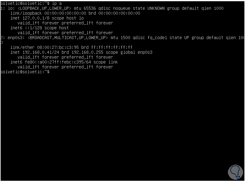 sudo rebootUna vez iniciemos sesión ejecutamos de nuevo el comando “ip a” para comprobar que los cambios realizados en la red han sido aplicados de forma correcta. Allí veremos la nueva IP establecida.