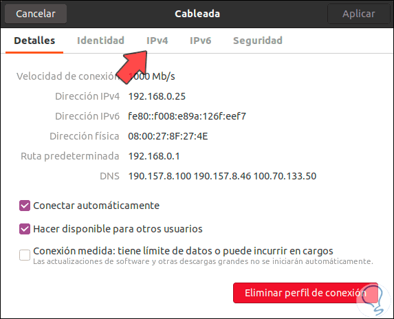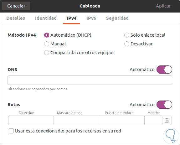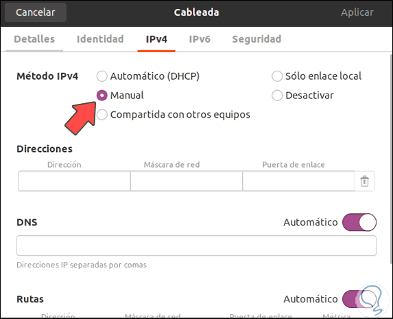 Vamos a la pestaña IPv4 y allí activamos la casilla “Manual” en la sección “Método IPv4”: