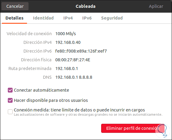 Damos clic de nuevo en el ícono de engranaje para acceder a la configuración de red, veremos que la IP asignada y el DNS ha sido establecido según nuestro criterio: