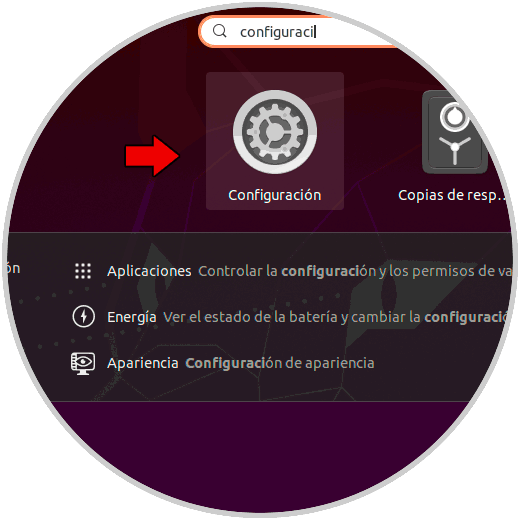 El primer paso será ir al buscador e ingresamos “configuración”: