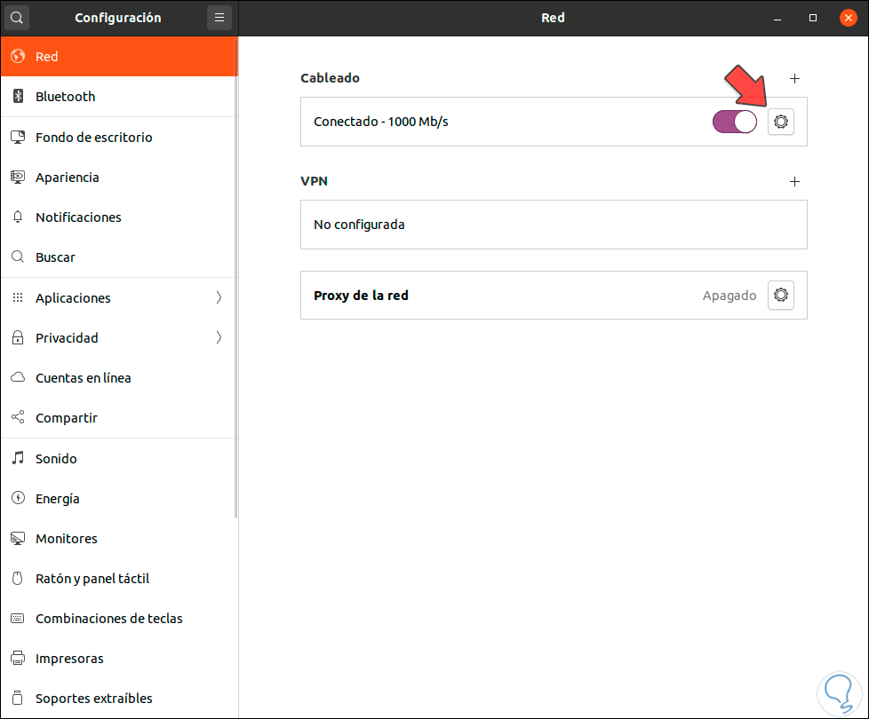 Seleccionamos la Configuración de Ubuntu y en la ventana desplegada vamos a la sección “Red”: