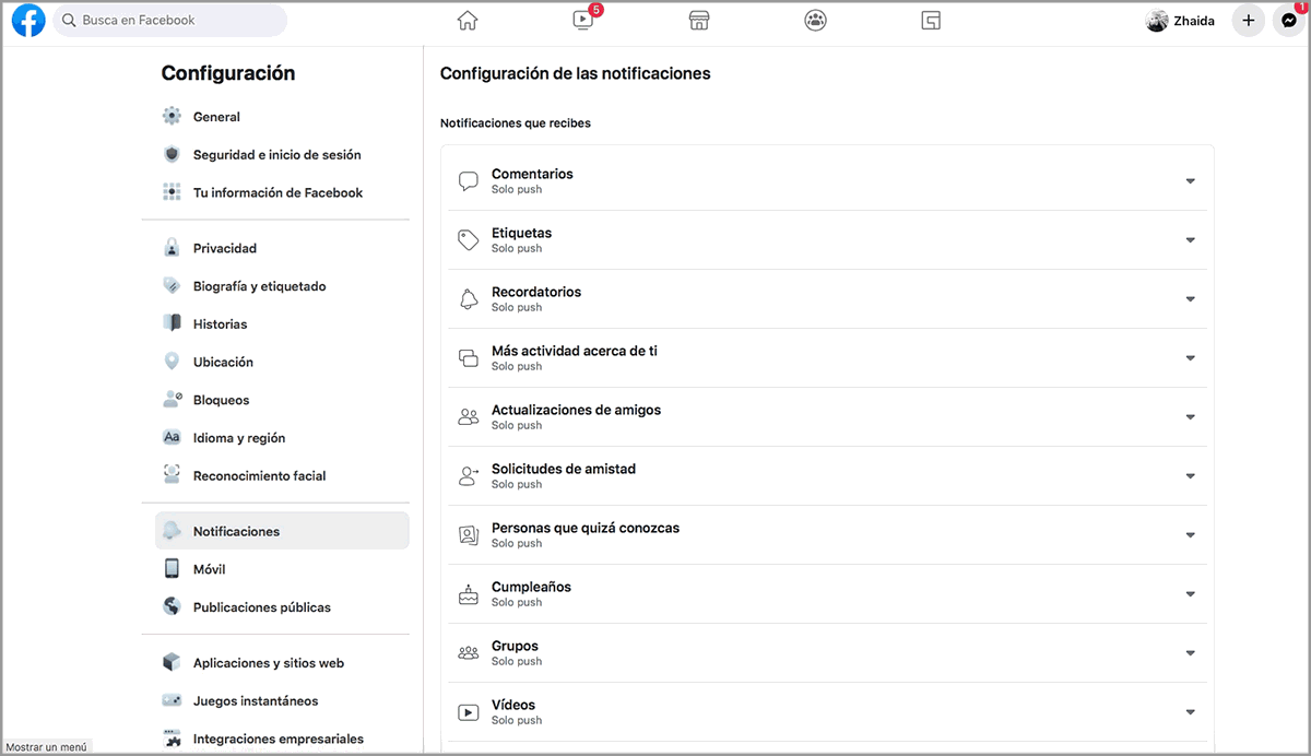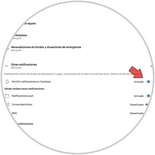 En el caso de que selecciones el apartado de "" podrás desactivar o activar todas las notificaciones "Push" de Facebook en PC.