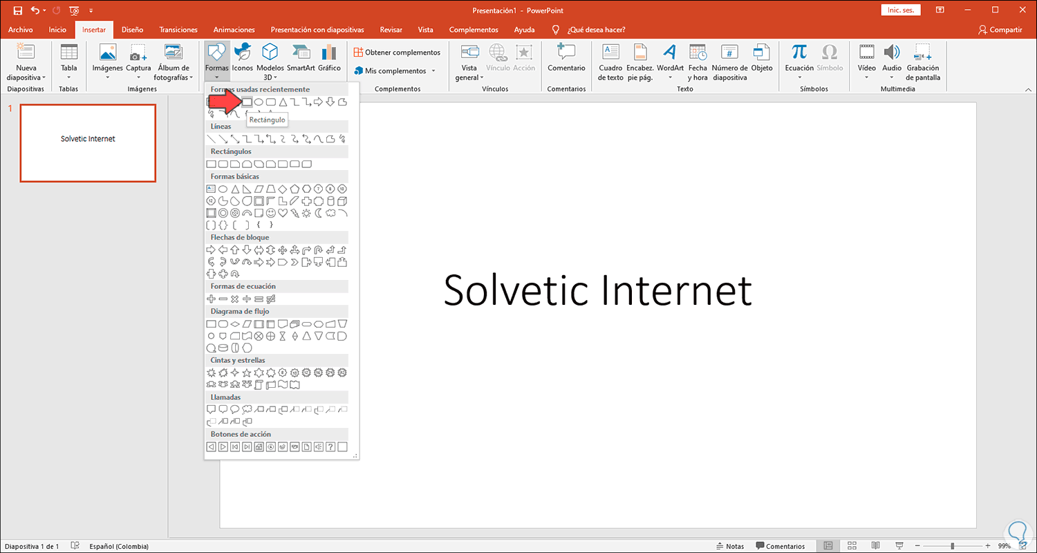 En caso de que en el proceso inicial no veamos la opción de transparencia, debemos añadir la imagen como Forma, para ello vamos al menú Insertar – Formas y seleccionamos “Rectángulo”:
