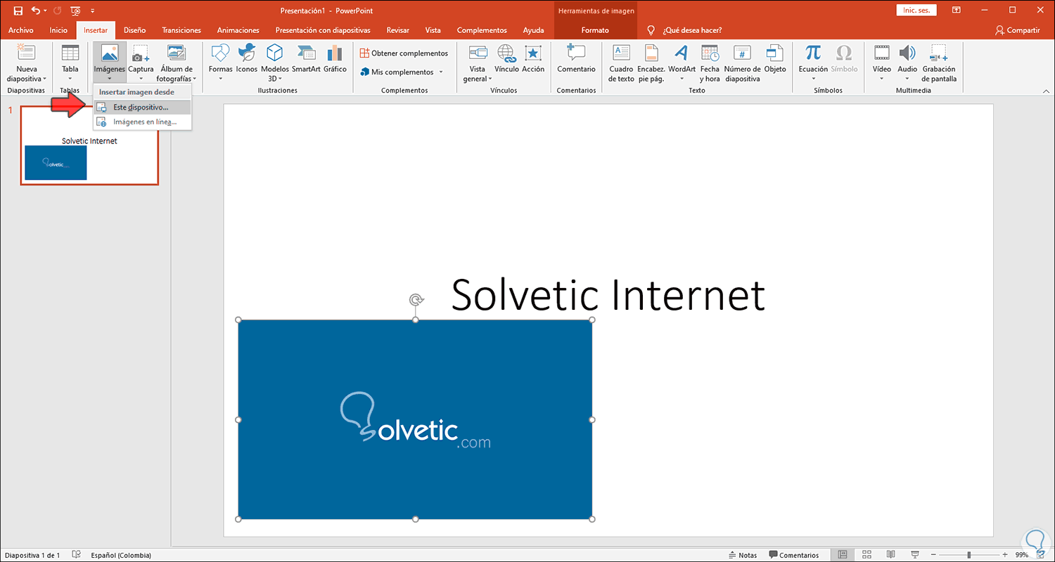 Lo primero que debemos realizar será ir al menú Insertar y en el apartado Imágenes seleccionamos la imagen deseada para la diapositiva: