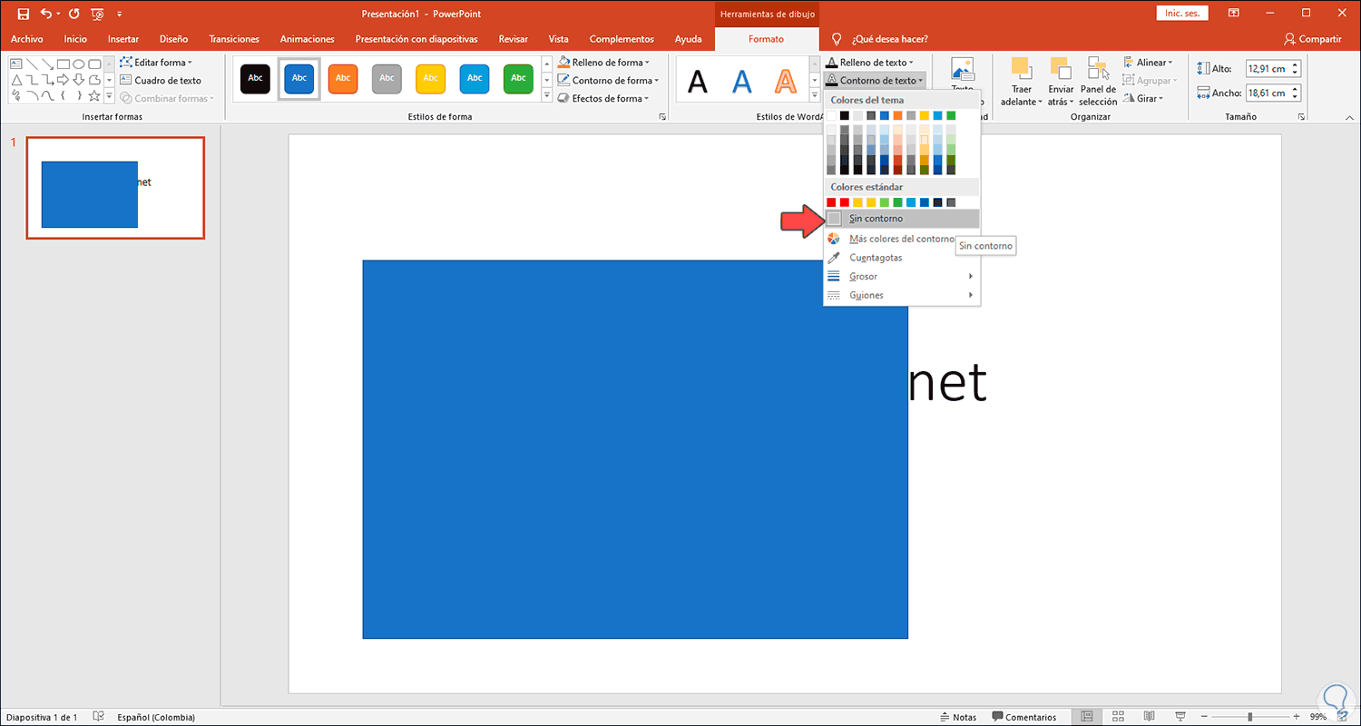Después de esto definimos las dimensiones del rectángulo, se activará el menú Herramientas de dibujo y allí iremos a la sección “Contorno de forma” y en el listado desplegado seleccionamos “Sin contorno”: