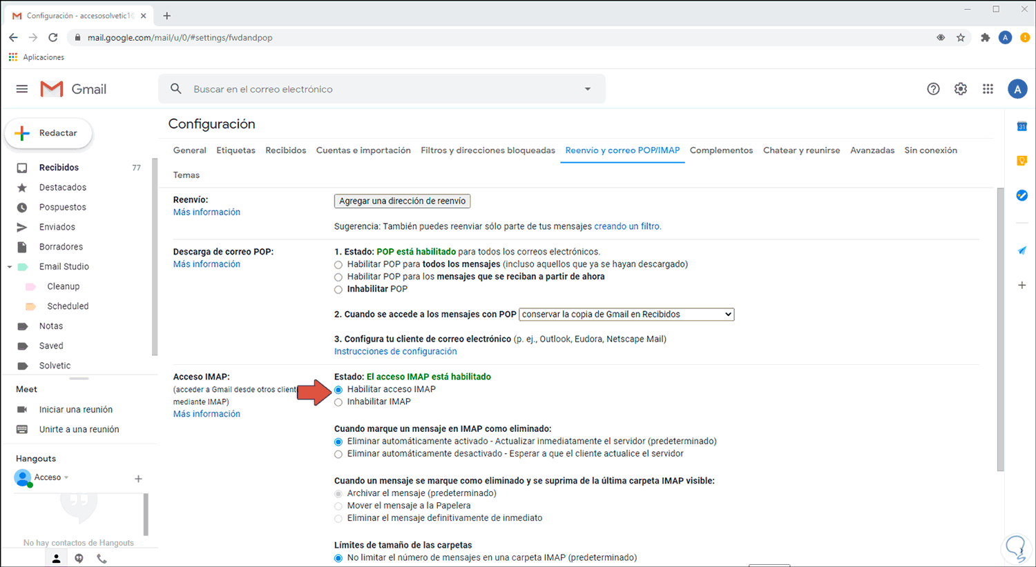 Después de esto iremos a la pestaña “Reenvío y correo POP/IMAP”, veremos lo siguiente. Allí confirmamos que la casilla “Habilitar acceso IMAP” se encuentre habilitada, si no es así la activamos y aplicamos los cambios.