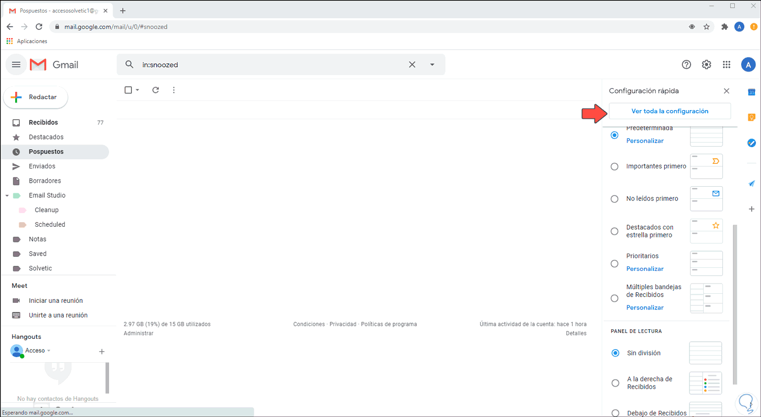 Para iniciar el proceso damos clic sobre el icono de engranaje (Configuración) en Gmail y luego damos clic en “Ver toda la configuración”: