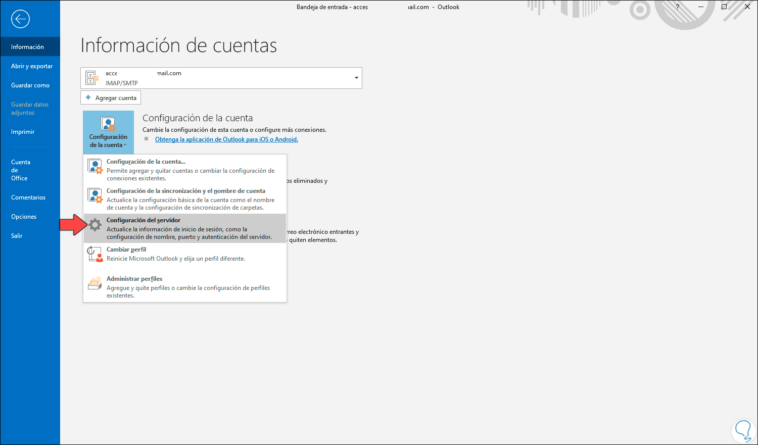 Para esto vamos a Outlook e iremos a “Archivo – Configuración de la cuenta – Configuración del servidor”: