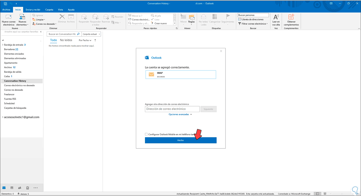 Damos clic en “Hecho” para completar el proceso, después de esto se iniciará el proceso de sincronización de los correos de Gmail en Outlook: