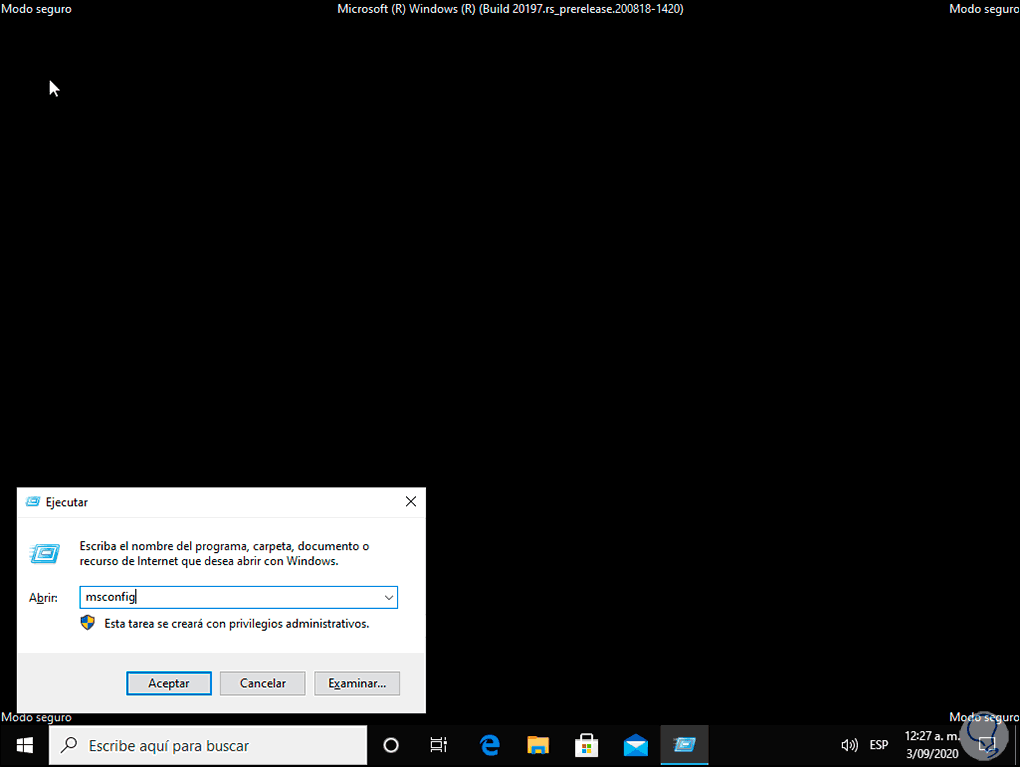 El proceso es simple, estando en el modo seguro ingresamos al comando Ejecutar e ingresamos “msconfig”: