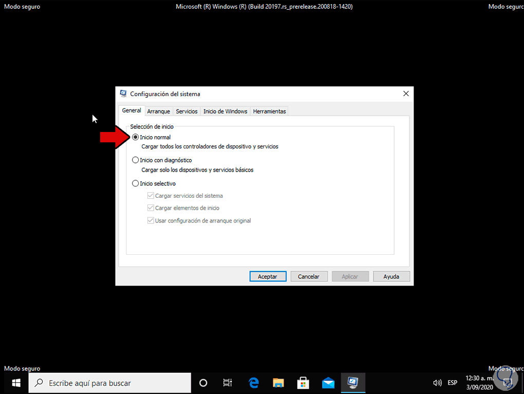 Msconfig es una línea de comandos en Windows 10 con la cual es posible administrar componentes de inicio del sistema, servicios, definir cual sistema será el definido por defecto y más, damos clic en Aceptar y en la ventana emergente vamos a la pestaña “General” y allí debemos activar la casilla “Inicio normal”: