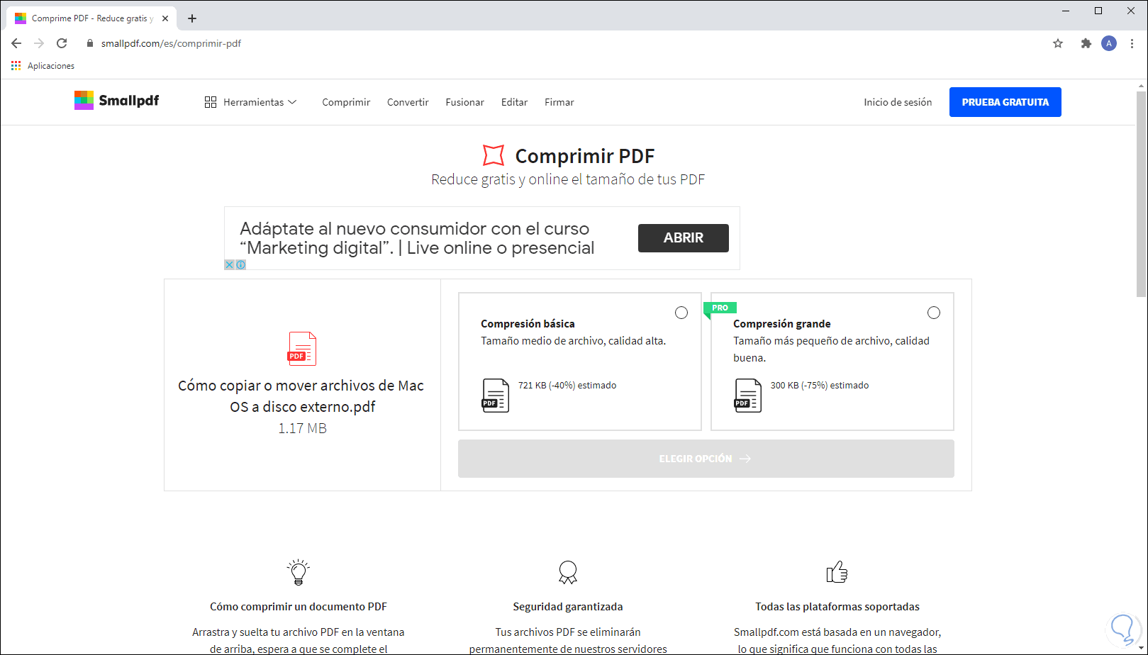 Una vez seleccionada damos clic en “Elegir opción” para dar paso al proceso de compresión del archivo seleccionado. Cuando esta finalice veremos lo siguiente.