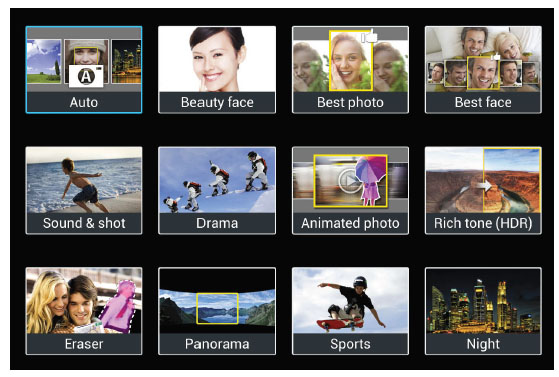 Este ícono abre una hilera de íconos en la parte superior de la pantalla para activar una serie de características especiales, entre ellas tenemos: flash, auto night detection, voice commands, video mode y sharing features.