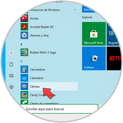 Otra de las opciones disponibles es usar el menú Inicio del sistema, para ello damos clic en el botón de Windows y ubicamos la aplicación Cámara: