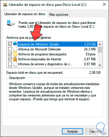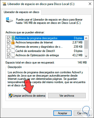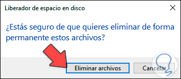 Podemos ver que en este caso son 2.83 GB de espacio en el disco, podemos seleccionar las casillas deseadas y confirmamos dando clic en Aceptar, veremos lo siguiente. Damos clic en “Eliminar archivos” para proceder con la eliminación de estos archivos. Después de esto es aconsejable reiniciar el sistema para completar el proceso.