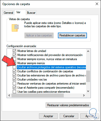 - Desactivar la casilla “Ocultar archivos protegidos del sistema operativo”