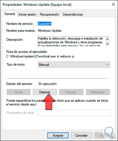 Veremos la siguiente ventana. Damos clic en “Detener” para que el servicio sea detenido y podamos trabajar sobre los archivos de las descargas de actualizaciones del sistema.
