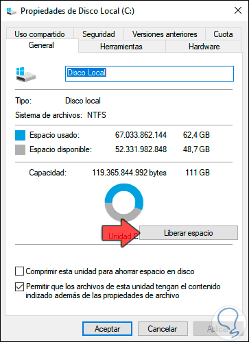 Allí damos clic en el botón “Liberar espacio” con el fin de que tengamos acceso a una serie de opciones que ocupan espacio en el disco con su respectivo tamaño: