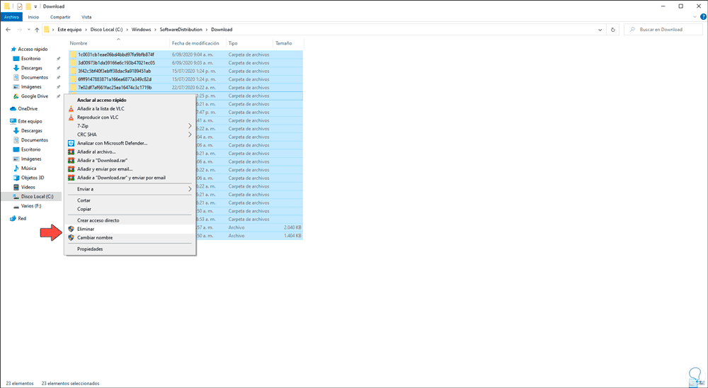 Vamos de nuevo a la carpeta Download, seleccionamos todos los archivos y elegimos “Eliminar”: