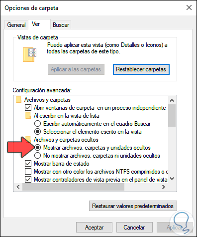 - Activar la casilla “Mostrar archivos, carpetas y unidades ocultos”