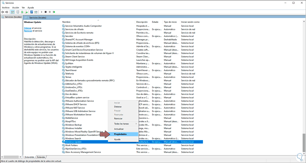 Después de esto debemos desactivar el servicio de Windows Update ya que estos archivos siguen ligados a este servicio con el fin de buscar, descargar y aplicar las actualizaciones, ingresamos “servicios” en el cuadro de búsqueda del menú Inicio y seleccionamos la plataforma de servicios locales de Windows 10. Allí ubicamos el servicio llamado “Windows Update”, damos clic derecho sobre el y en el listado desplegado seleccionamos “Propiedades”: