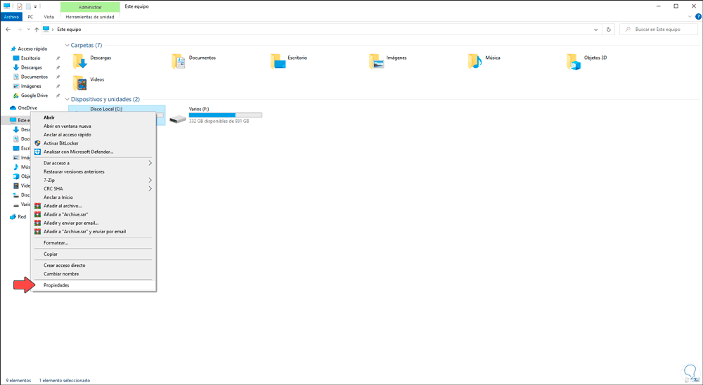 Además de esto, existe otro método para borrar las actualizaciones del sistema, para esto vamos al Explorador de archivos y allí damos clic derecho sobre la unidad C y seleccionamos “Propiedades”: