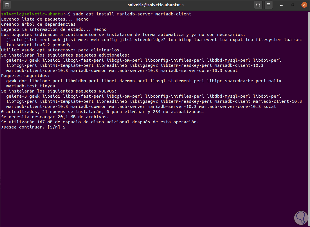 Ahora instalaremos el gestor de base de datos el cual será MariaDB, para ello ejecutamos lo siguiente: