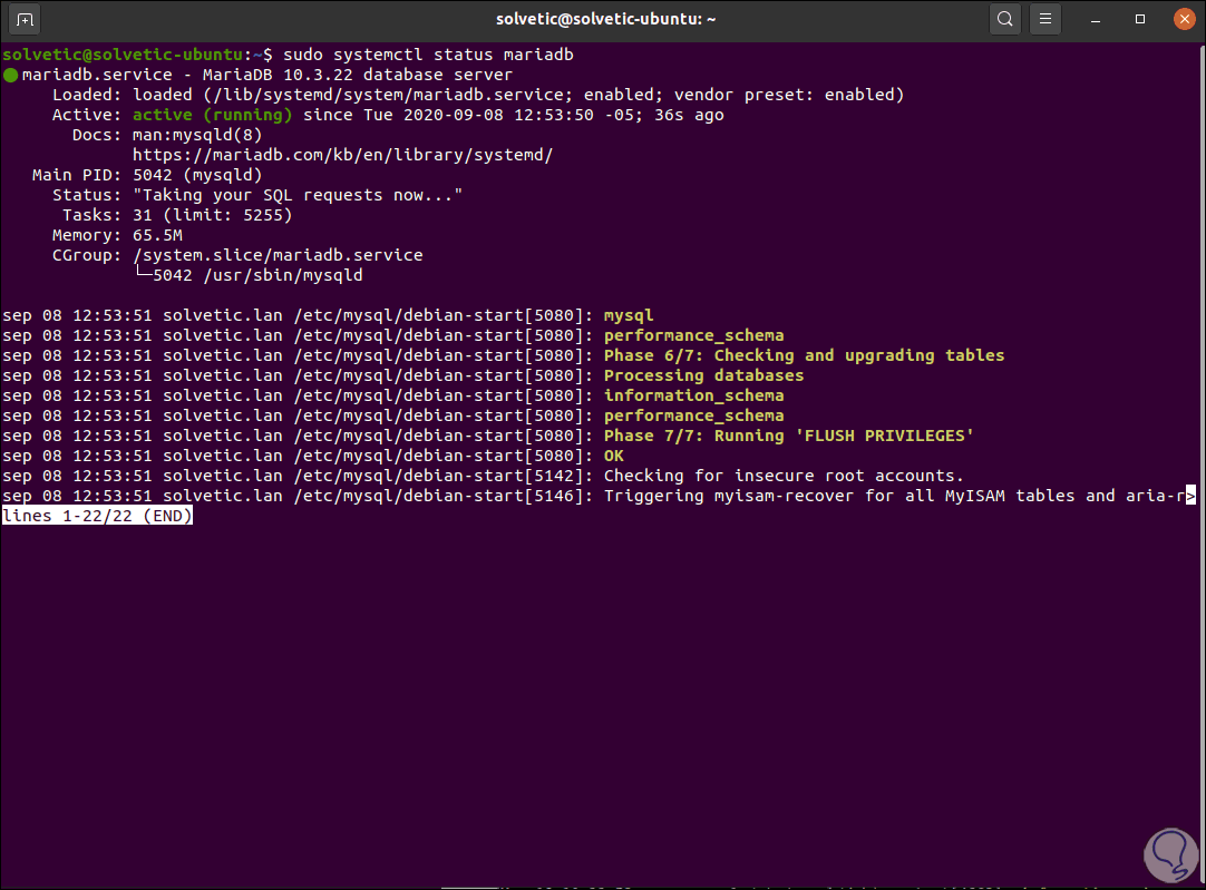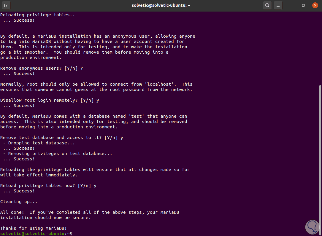 El siguiente paso será asegurar la instalación de MariaDB con el siguiente comando: