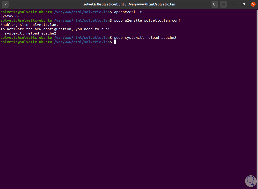 apache2ctl -t sudo a2ensite solvetic.lan.conf sudo systemctl reload apache2