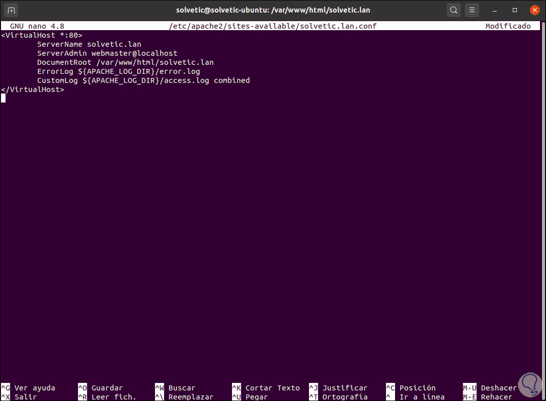 sudo nano /etc/apache2/sites-available/solvetic.lan.conf