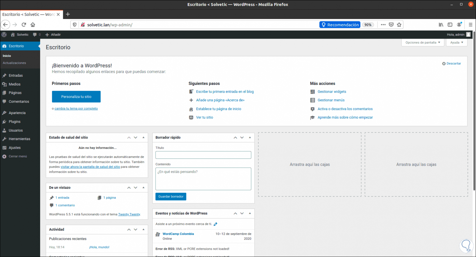 Clic en “Acceder” y este será el entorno de WordPress en Ubuntu 20.04: