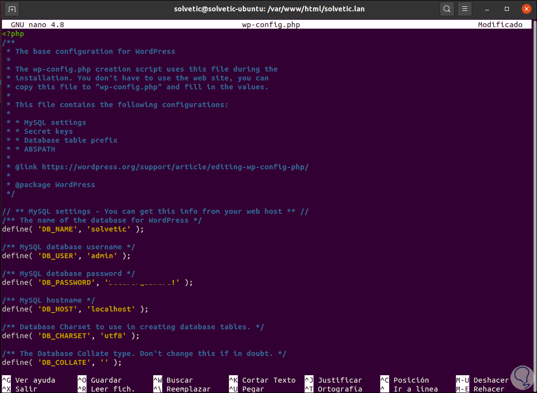 sudo nano wp-config.phpAllí veremos lo siguiente: