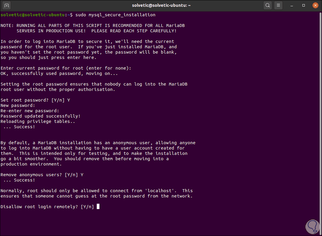 sudo mysql_secure_installationIngresamos la contraseña deseada para el usuario root y luego respondemos lo siguiente: