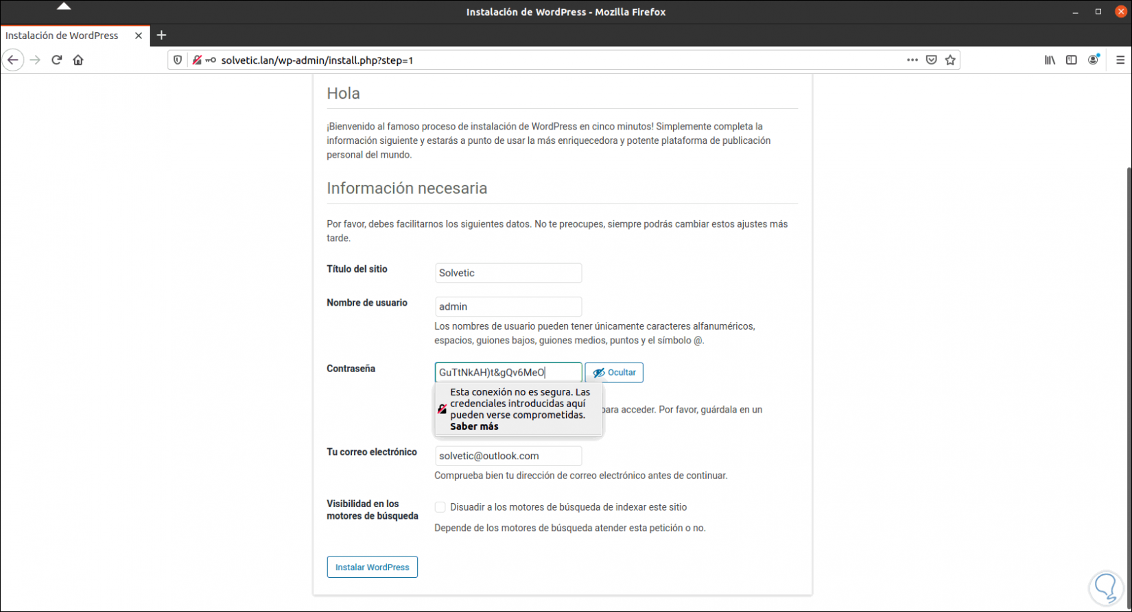 Completamos los datos solicitados y damos clic en “Instalar WordPress” para completar el proceso: