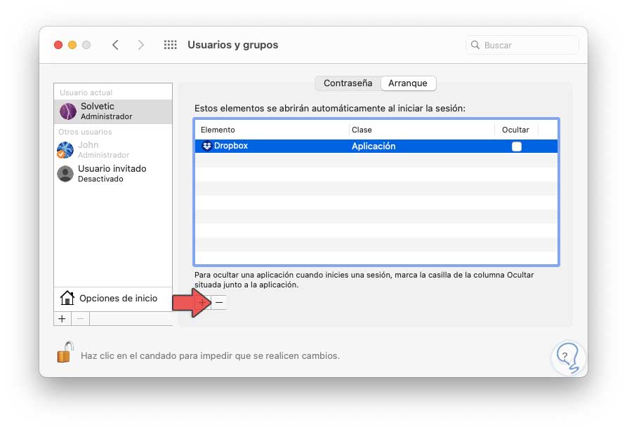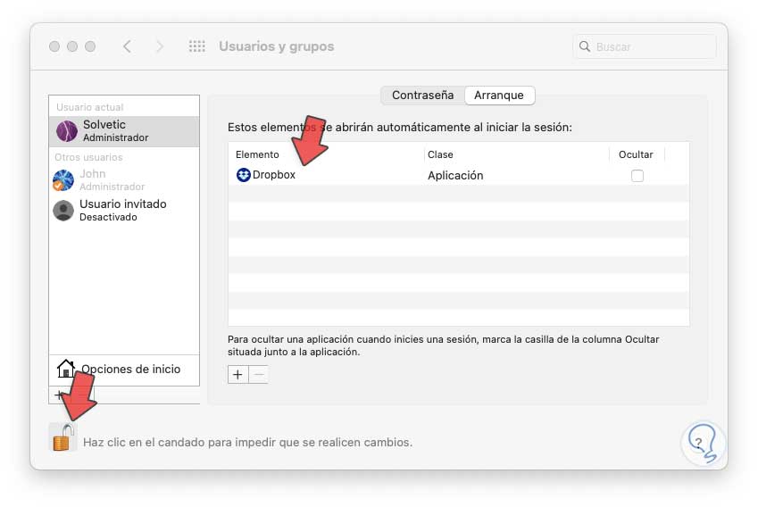 Damos clic sobre el signo – ubicado en la parte inferior para borrar Dropbox del inicio de macOS. Damos clic sobre el candado para prevenir los cambios.