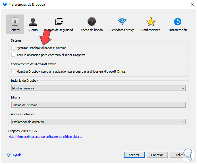Damos clic en “Preferencias” y en la ventana emergente desactivamos la casilla “Ejecutar Dropbox al iniciar el sistema”. Damos clic en Aplicar y luego en Aceptar para aplicar los cambios.